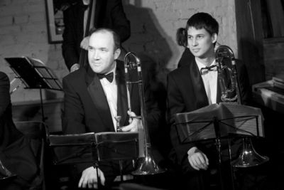 Ядро секции тромбонов c самого основания ансамбля составляют Рашид Кулеев, Сергей Серов, Дмитрий Толпегов и я, Максим Пиганов. Все мы также играем в других коллективах: Рашид и я – в оркестре имени Лундстрема, Дмитрий Толпегов и Сергей Серов – в команде «Файер-шоу». Когда кто-то из основной четверки сыграть не может, я приглашаю других музыкантов. Иногда с нами играет бас-тромбонист Михаил Жижин, также музыкант оркестра имени Лундстрема. И совсем недавно я стал привлекать к концертам своего ученика, студента второго курса РАМ им. Гнесиных Антона Гимазетдинова. Я считаю, что это очень способный парень, но пока боюсь перехваливать (смеется). Антон участвует в студенческом оркестре Анатолия Кролла и в новом, только-только появившемся «Большом Джазовом Оркестре» под управлением молодого трубача Петра Востокова.