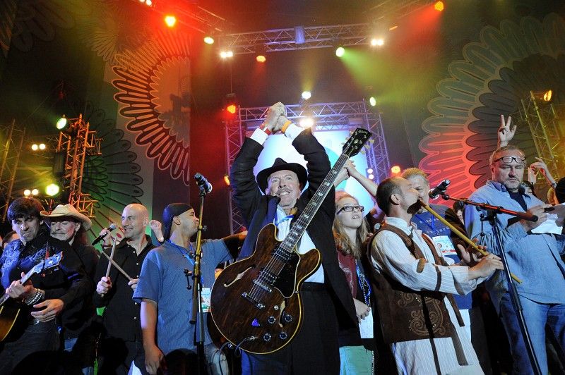 За сценой тем временем западные мэтры рассматривали выступление Фогерти с кислыми минами. Неугомонный Лайдон перехватил меня у гримерки, наконец-то прикончив коньяк, и начал подтягивать "Have You Ever Seen The Rain". "Я спел бы эту песню горааааздо лучше!" - безапелляционно сообщил он. Я не нашел ничего лучше, чем поддакнуть (а то кто знает, на что способен угоревший панк?): "Джон, да ты любую песню лучше всех споешь!. "Да я гляжу, ты разбираешься в музыке!" - приосанивается Лайдон. Ф-фух, инцидент исчерпан. Ублаготворившийся Лайдон уезжает в отель, а я мчусь смотреть финальный номер фестиваля - джем.