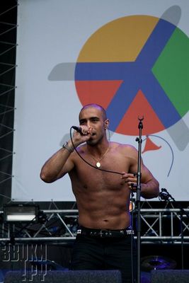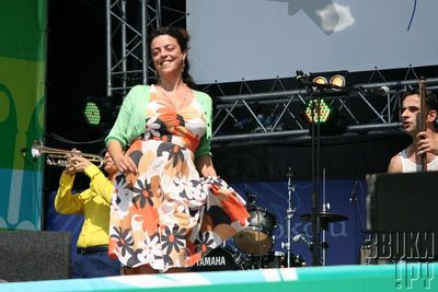 Тут-то и появляется первый рояль из кустов: на сцену выходит кураист Роберт Юлдашев с сопровождающим бэндом, которые минут пятнадцать разогревают публику отчаянным попурри из известных рок-мелодий и народных песен. А затем словно океанским бризом повеяло - под перебор гитарных струн на сцену выпархивает Миранда, вокалистка португальской группы O'queStrada, под зажигательные ритмы которых площадь просто взрывается. Надо отметить удивительную приспособляемость португальцев даже к самым суровым условиям: у O'queStrada, прилетевших на фестиваль рано с утра, практически не было времени на отстройку звука. Но, привыкшие к уличным выступлениям музыканты быстренько со всем справились - и прозвучали не просто убедительно, а выдали совершенно сумасшедший драйв, вытащив в середине сета потанцевать даже ведущую концерта Ксению Стриж.