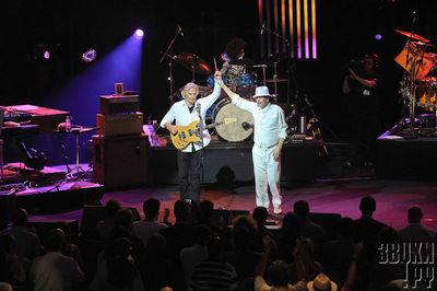 MJF открылся концертом-ретроспективой Карлоса Сантаны (Carlos Santana) и Джона Маклафлина (John McLaughlin). 40 лет назад, в 1973 году два мэтра гитары записали совместный альбом ”Love, Devotion, Surrender”, который многие считают отправной точкой для развития джаз-фьюжн. Сейчас они специально встретились на сцене Монтре, чтобы исполнить несколько вещей из той легендарной программы. В ней отлично уживаются Колтрейн, Боб Дилан и Led Zeppelin. Построена она как короткий экскурс в историю фьюжн с обязательными элементами самопрезентации: каждый мастер показывает лучшее, на что он способен, исполняя программу другого. В ”Stairway To Heaven” они четко прорисовывают структуру песни, делают ее чуть угловатой; и лохматый Маклафлин охотно берет на себя партии ритм-гитары, а Сантана щедро обвешивает каждый куплет каденциями. И, наоборот, в акустических импровизациях Маклафлин лидирует, а Сантана мурлычет что-то под сурдинку... Нет, не удержался – выдал рефрен из ”Desperado”!