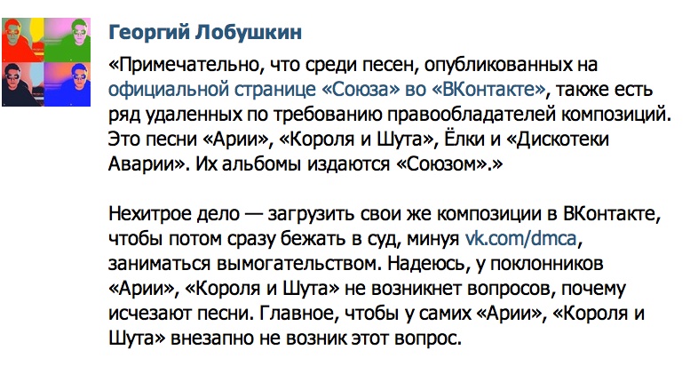 Между тем, развитие сюжета показывает, что сам лейбл, борясь за чистоту каталога, ведет себя в этой ситуации отнюдь не безупречно. Пресс-секретарь «ВКонтакте» Георгий Лобушкин заявил, что "Студия Союз" сама выкладывает аудиозаписи на официальной странице студии в "ВКонтакте".